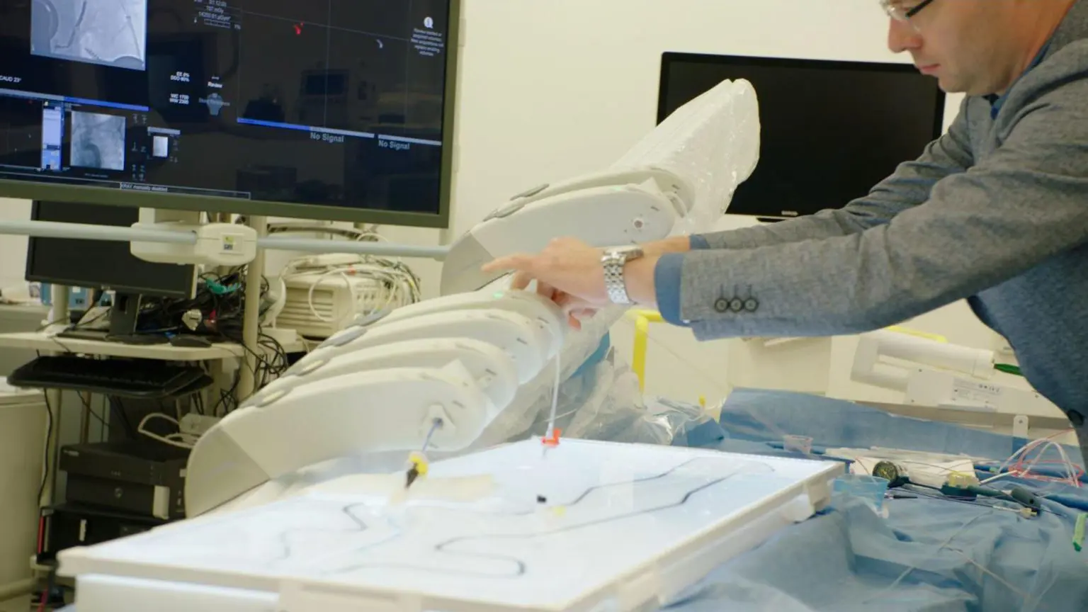 Хирург, находясь в другом месте, может держать и перемещать свои провода, а робот выполняет те же движения в режиме реального времени на пациенте, выполняя тромбэктомию.